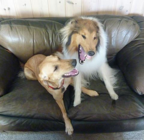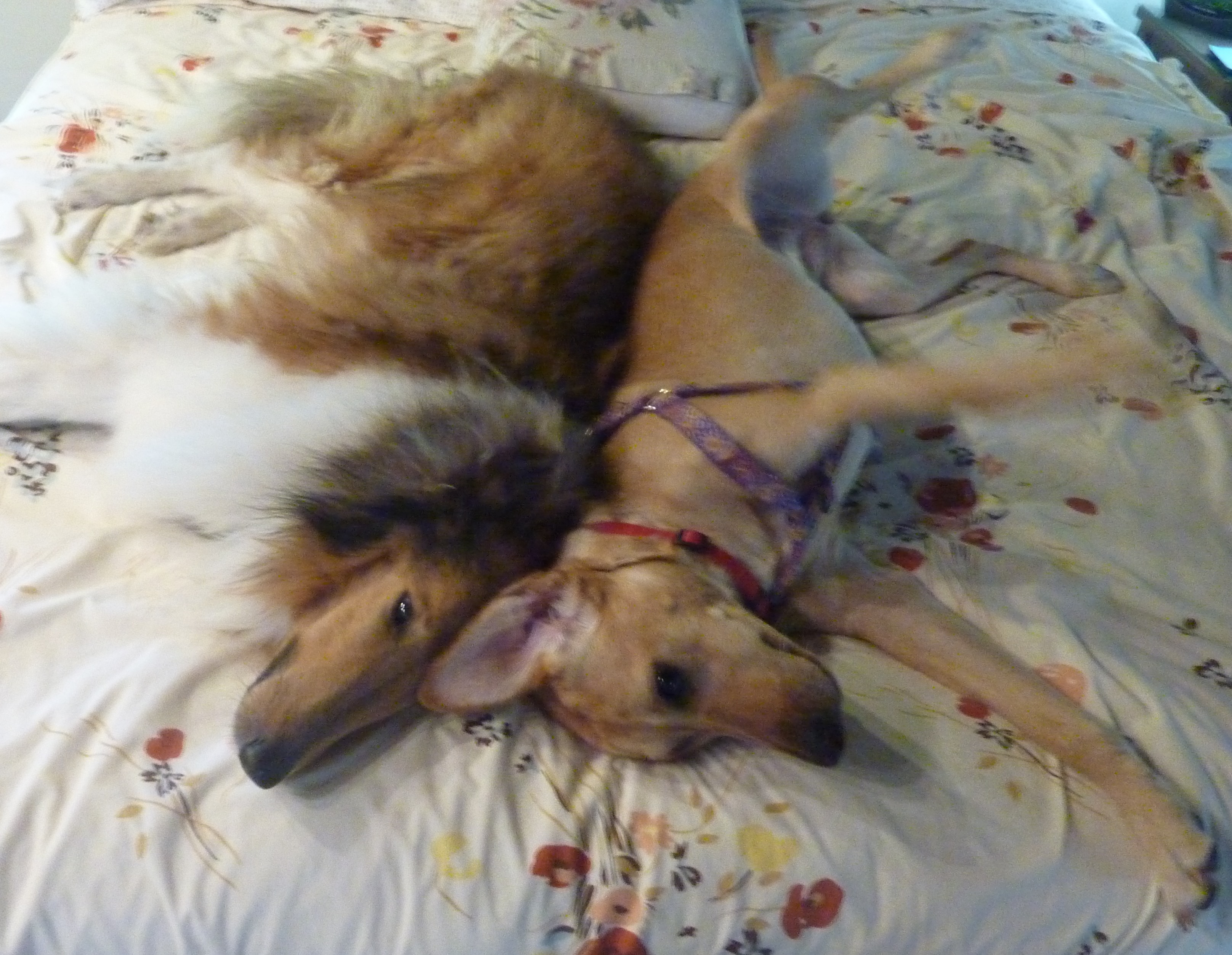Gracie joined our family on a snowy day in December. Once she arrived at our home, she met our resident dog Laser nicely, explored a bit, and then the races began! She and Laser have become great play buddies, but I have to admit that she is one of the most sneaky toy thieves I have ever seen. Laser is very tolerant of what I call her "drive-by toy snatches" right out of his mouth. They have a good time together, sometimes chasing each other through the house like crazy dogs and sometimes just chillin'.